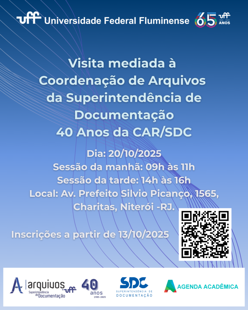 A Universidade Federal Fluminense (UFF), por meio da Superintendência de Documentação (SDC), tem a satisfação de convidar a comunidade acadêmica, ex-servidores e o público em geral para a Cerimônia de celebração dos 40 anos da Coordenação de Arquivos (CAR/SDC). O evento marca quatro décadas de dedicação à preservação da memória institucional e ao fortalecimento da gestão documental da UFF.